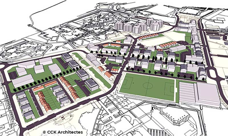 Le Projet Programme : 24 ha Maîtrise d’Ouvrage : Communauté d’agglomération de Saint Quentin en Yvelines Architecte : CCK Architectes Lieu : Trappes (78) Date de livraison : 2014 Démarche développement durable L’ensemble des opérations sera certifié « Habitat et Environnement » ou « NF Logement – Démarche HQE® » avec le label Très Haute Performance Energétique (THPE) Performance énergétique : Cref – 20 %