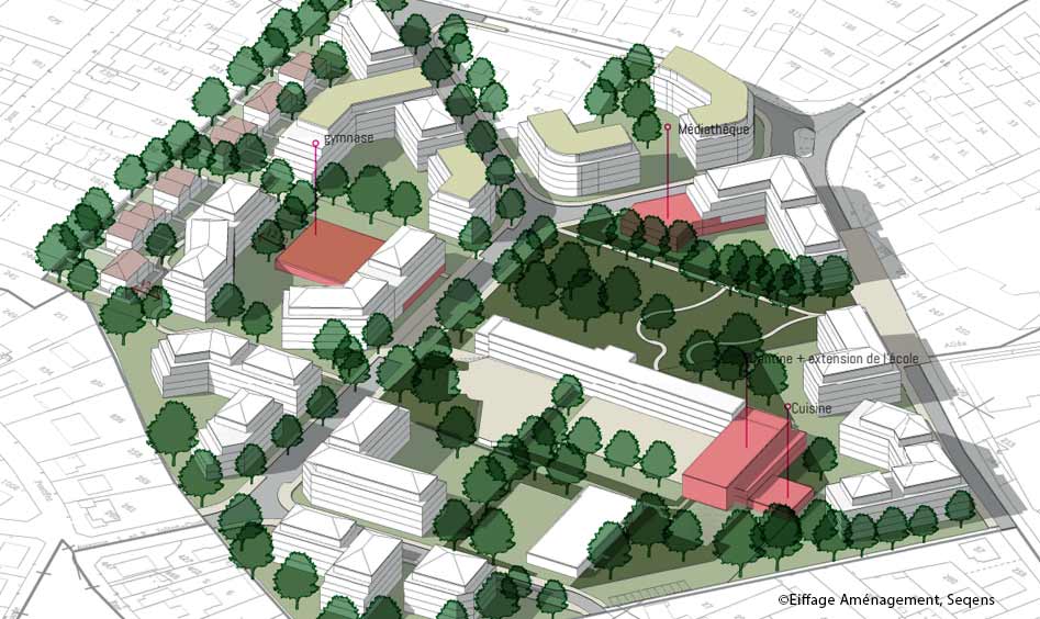 Programme : 42 000 m² SDP de logements et 6 100 m² SDP d’équipements Maîtrise d’Ouvrage : Eiffage Aménagement et Seqens Urbaniste : A26 Lieu : Igny (91) Date prévisionnelle de livraison : 2026 (1ères livraisons) Démarche développement durable Conception bioclimatique du quartier Végétalisation et favorisation de la biodiversité Gestion alternative des eaux pluviales et limitation de l’imperméabilisation Valorisation des matériaux Mise