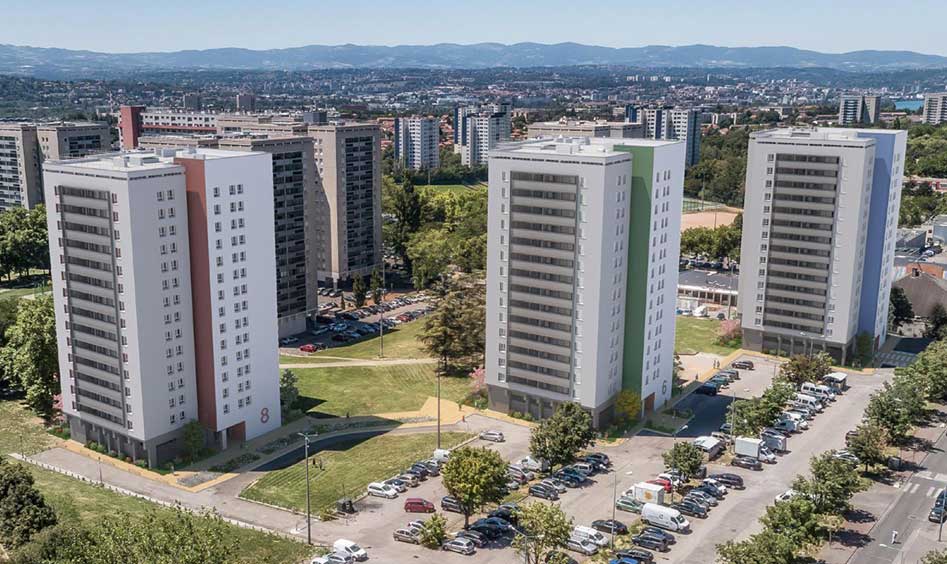 Le Projet Programme : 18 000 m2 Maîtrise d’Ouvrage : Alliade Habitat Entreprise Générale : Léon Grosse Lieu : Vénissieux (69) Date prévisionnelle de livraison : 2025 Montant des travaux : 10,5 M€ Démarche développement durable Isolation des façades par l’extérieur & changements des menuiseries Changement des systèmes de ventilation Changements des terminaux de chauffage collectif (approvisionnement par réseau de chaleur urbain)