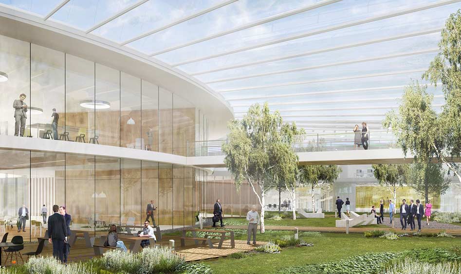 - Le projet est conçu à partir de la notion de « campus », et vise la création d’environnements de travail de qualité qui stimulent la collaboration et privilégient les conditions de vie et de confort des usagers